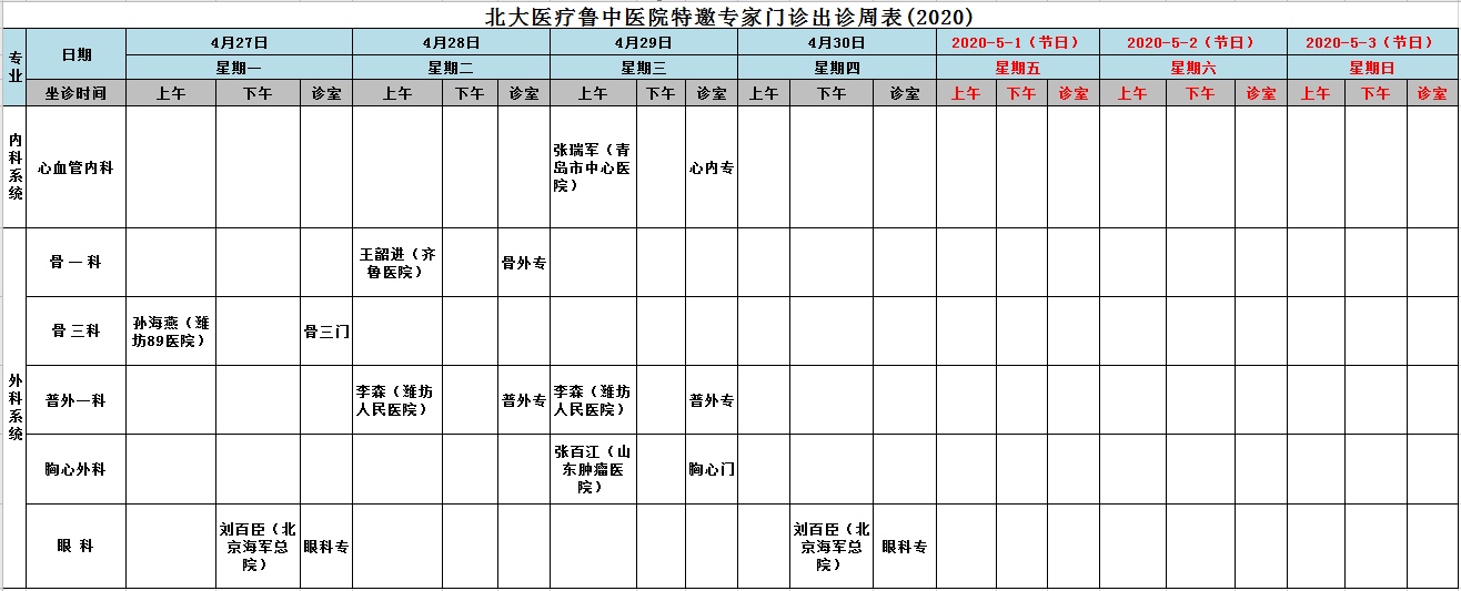 2020北大医疗鲁中医院特邀专家门诊出诊周表